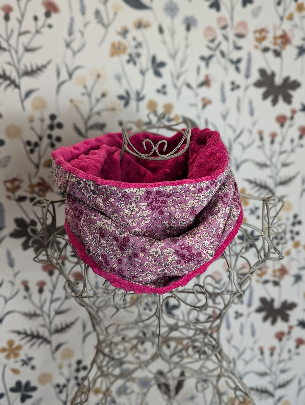 Tour de cou éventails fleurs / minky à pois fuschia (Taille adulte